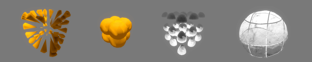 Everything begins with a signed distance field (SDF): a 3D texture of density values. I fill it on the GPU. First a sphere, then I carve it with layered Simplex/FBM noise. That gives me a nice, editable planet in a single volume.